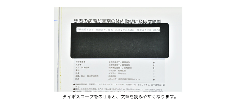 文章を読み書きするときに、スリット入りの黒い厚紙を当てると、行末から行頭へスムーズに視線を移動できます。ハガキの住所、名前のサイズ、書類の署名のサイズなどを使うと自分で書くことが可能になります。