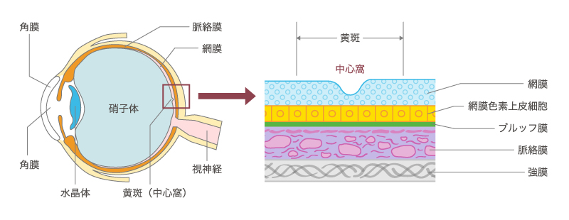 欧米人に多い病気とされてきましたが、食生活の変化などで、日本でも増えています。黄斑部は、網膜の中でも視力をつかさどる重要な細胞が集中している網膜の中心部です。加齢黄斑変性は、加齢などにより黄斑部が障害される病気です。