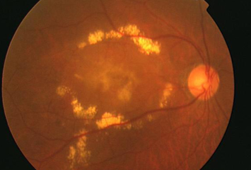 加齢黄斑変性の眼底・出血や浸出斑がみられる眼底