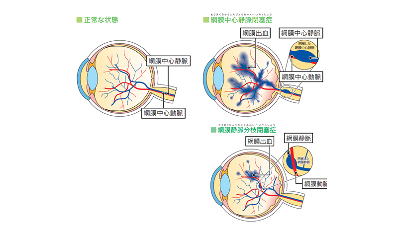 網膜静脈閉塞症は、網膜の動脈と静脈の交叉部で、動脈が静脈を圧迫して静脈閉塞が起き、破綻性の出血を起こす病気です。視神経内で静脈が閉塞する網膜中心静脈閉塞症と、網膜内の静脈が閉塞する網膜静脈分枝閉塞症があります。