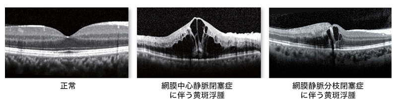 網膜の層構造を断面的に観察でき、黄斑浮腫の状態がわかります。