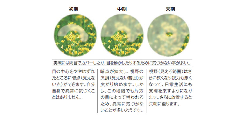 緑内障は、何らかの原因で視神経が障害され、 視野(見える範囲)がゆっくりと狭くなっていく病気です。眼圧の上昇がその原因の一つですが、日本人は正常眼圧なのに視野障害が進行する人が50~70%もいることがわかっています。初期には自覚症状が全くないため、健診がとても大切です。