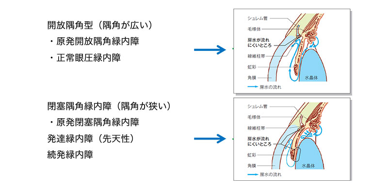原発緑内障はさらに原発開放隅角緑内障、原発閉塞隅角緑内障に分けられます。