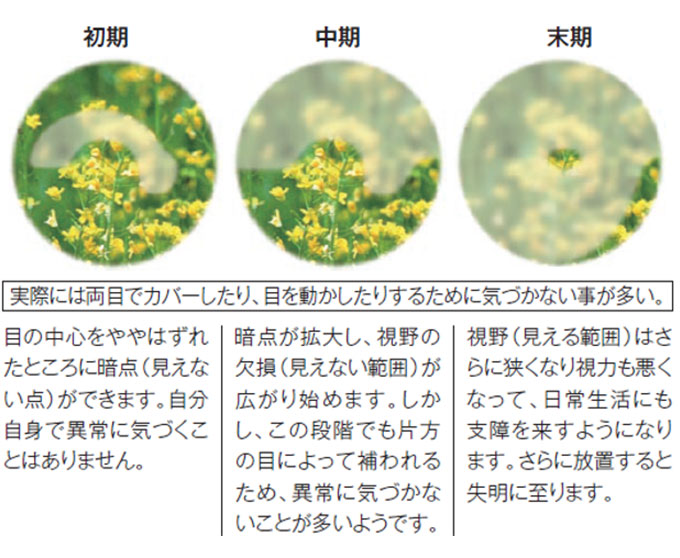 緑内障は、何らかの原因で視神経が障害され、 視野(見える範囲)がゆっくりと狭くなっていく病気です。眼圧の上昇がその原因の一つですが、日本人は正常眼圧なのに視野障害が進行する人が50~70%もいることがわかっています。初期には自覚症状が全くないため、健診がとても大切です。