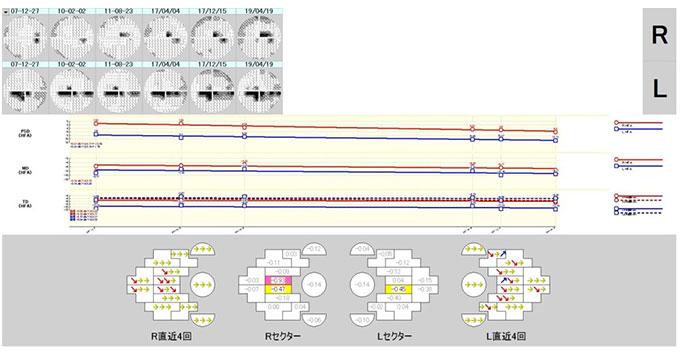 緑内障治療では、点眼の回数、時間を守ることが大切です。 しかし、毎日続けることはたいへんなことです。特に、緑内障初期で自覚症状が全くない方は、モチベーションを維持するのに努力を要すると思います。 当院では、視野検査の結果を経時的にチャートで示し、解析することで、点眼の重要性を再確認するようにしています。