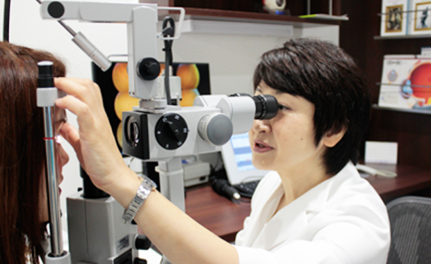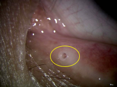 ホットタオルで温めたあとに、マイボーム腺梗塞部の処置を行います。加齢が原因で起きますが、若年でもアイメイクが原因で生じたりするので、要注意です。