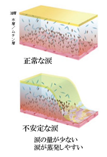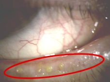 涙の油層は瞼の上下縁に20~40個あるマイボーム腺という腺から産出されますが、なんらかの原因でマイボーム腺が梗塞するとマイボーム腺機能不全を起こし、その結果涙液の油層がうまく形成されずにドライアイを引き起こします。